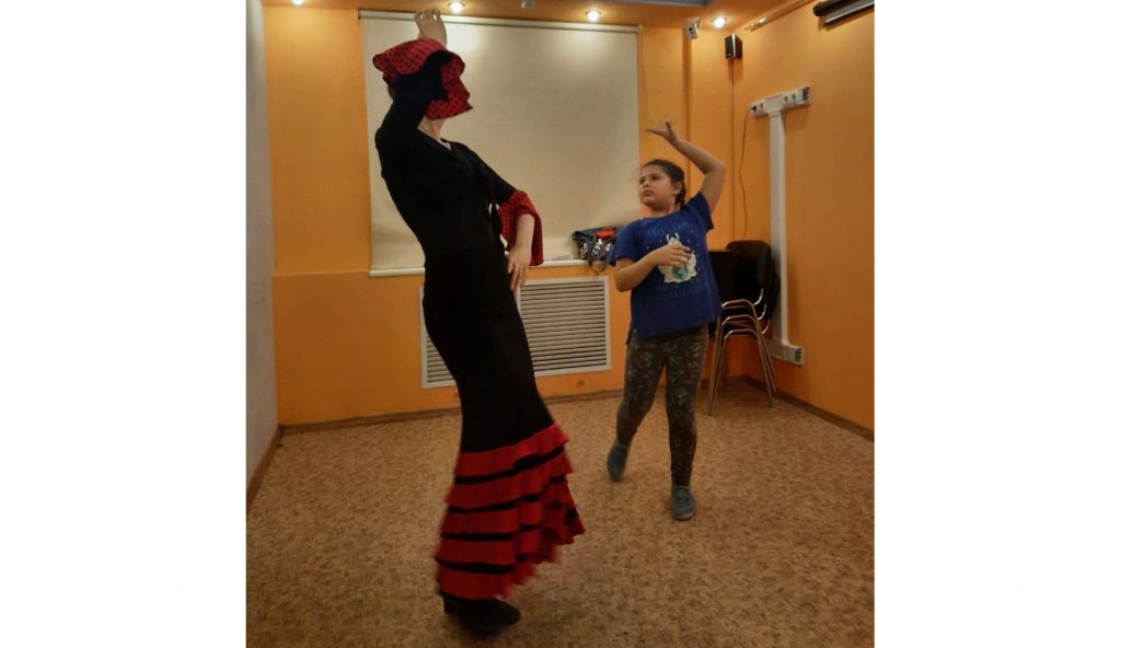 Занятие прошло в малой группе, где юной участнице проекта в течение часа удалось познакомиться с основами танца, выучить некоторые движения и почувствовать ритм фламенко.