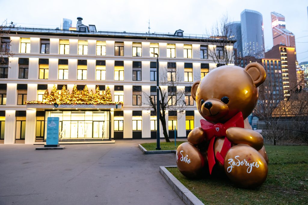 Во взрослых поликлиниках нарядили ёлки и повесили праздничные гирлянды. Кроме того, пациенты как детских, так и взрослых поликлиник могут увидеть праздничные арт-объекты — золотых медвежат с конфетами и бантами. Этот образ традиционно ассоциируется с праздником и вызывает теплые ассоциации.